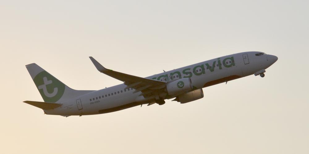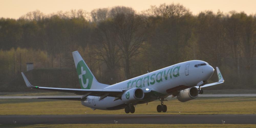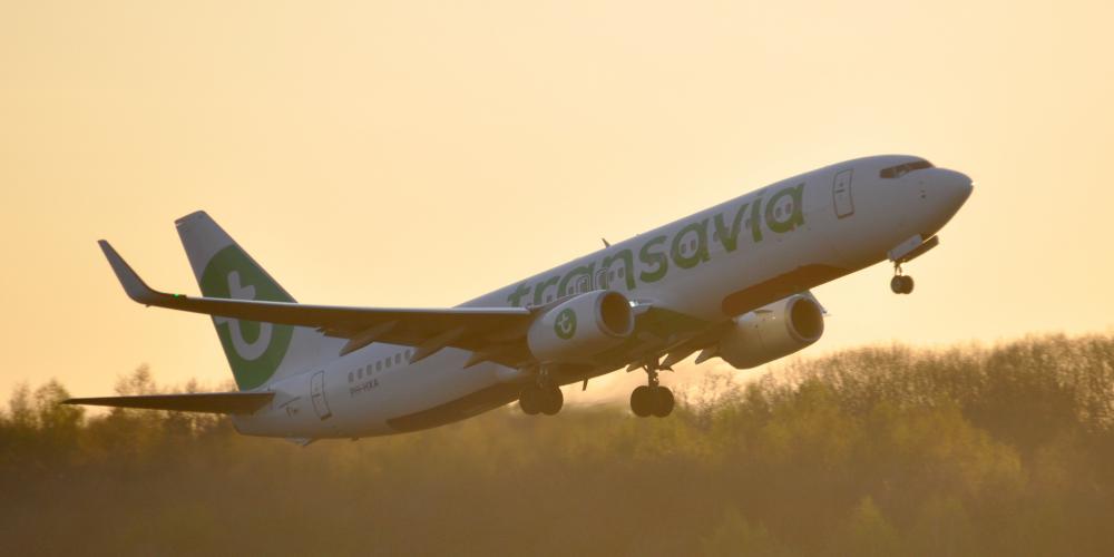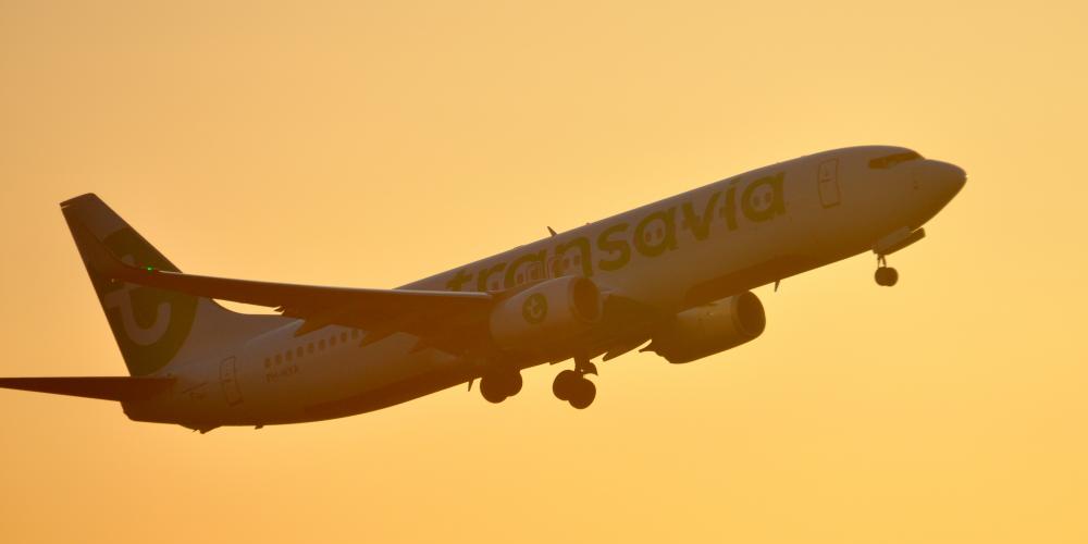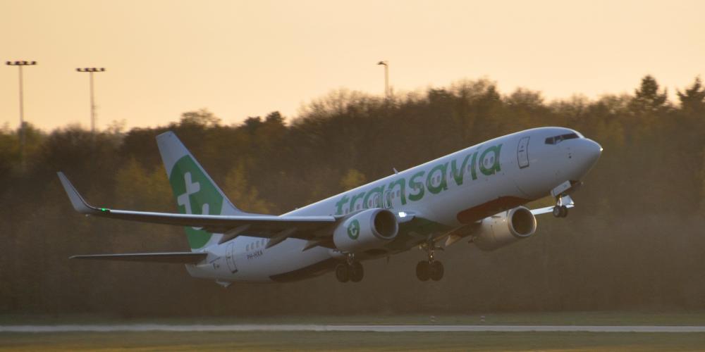 Take-off of Boeing 737 at sunset