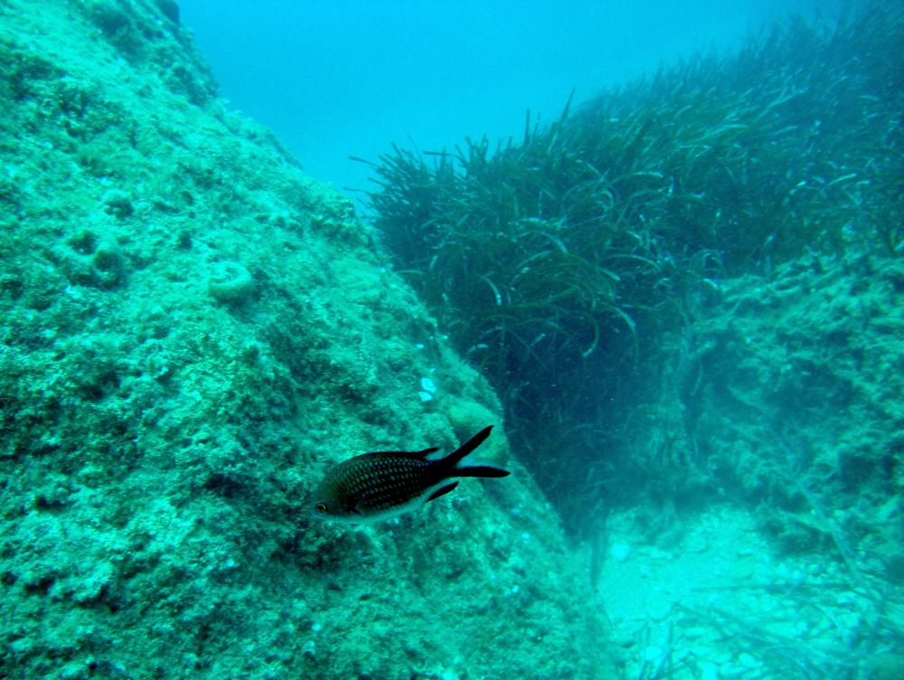 Duiken 2015 : 20150520-2 : 20150520-S588-Chromis-chromis-Mediterranean-damselfish-vis-DamnoniOldHarbour-Kreta-GR |